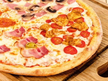 бекон, перец болгарский, помидор, шампиньоны, курица, моцарелла, соус bbq, соус жульен