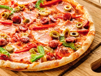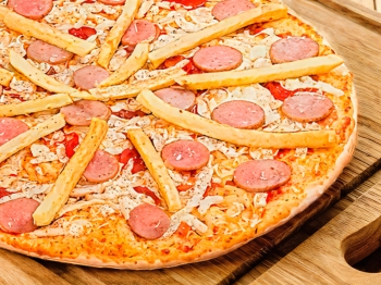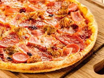 колбаски охотничьи, перец болгарский, ветчина, маслины, помидор, моцарелла, соус фирменный