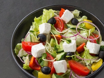 салат, помидор, огурец, перец болгарский, лук красный, маслины, сыр фета, масло оливковое