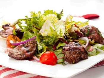 печень куриная, черри, салат, орехи кедровые, пармезан, бекон, заправка фирменная, лук красный