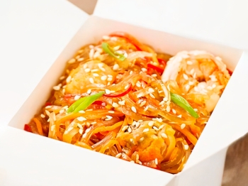 морепродукты, лапша рисовая, цукини, перец болгарский, морковь, шампиньоны, кунжут, соус сладкий чили
