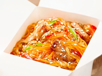 свинина, лапша рисовая, цукини, перец болгарский, морковь, шампиньоны, кунжут, соус кисло-сладкий